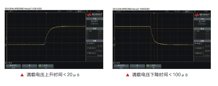 N83624系列具有快速的动态响应能力,10%负载-90%负载,恢复到原电压-50mV以内的时间<200μs,保证电压或电流的上升波形高速且无过冲,为待测物提供了稳定的供电,符合对电源要求苛刻的产品测试要求。